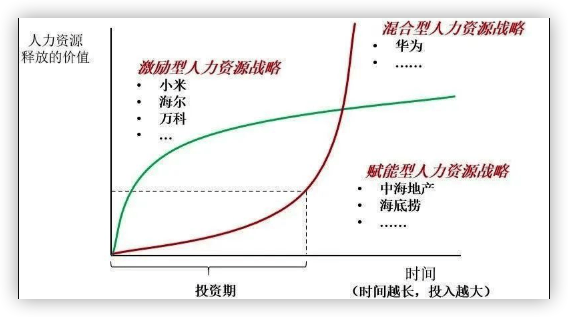 华为是典型的例子,为员工设置了人才培养长周期,抵达产出的拐点之前(成为华为的“奋斗者”)以赋能为主,而在拐点到达之后则以激励为主,员工不仅可在项目中获取丰厚的奖金,还可以分享TUP激励,即有效期为5年的股权激励。