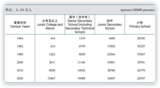 | 人口总计 | 大专以上 | 高中(含中专) | 初中 | 小学 |