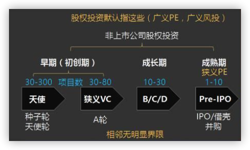 | PE(Private Equity) | 私募 | 一般投的企业已经到了比较后期的地步,企业形成较大规模,产业规范。换取的股份多数不会超过 20%,往往投 C 轮之后,被选择的公司,未来 2~3 年有上市的希望 |